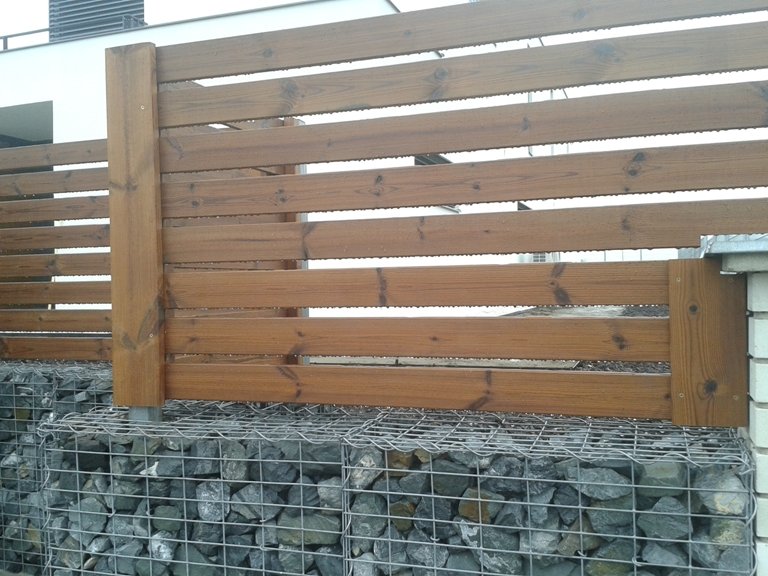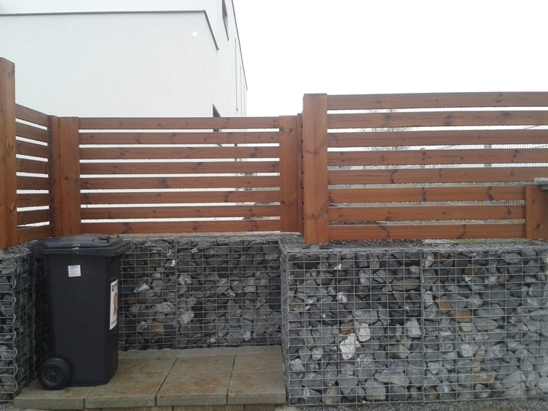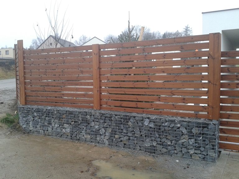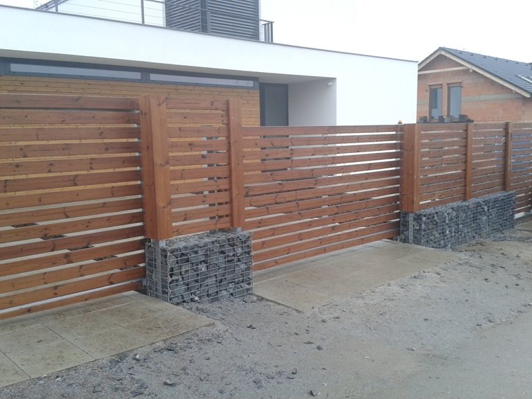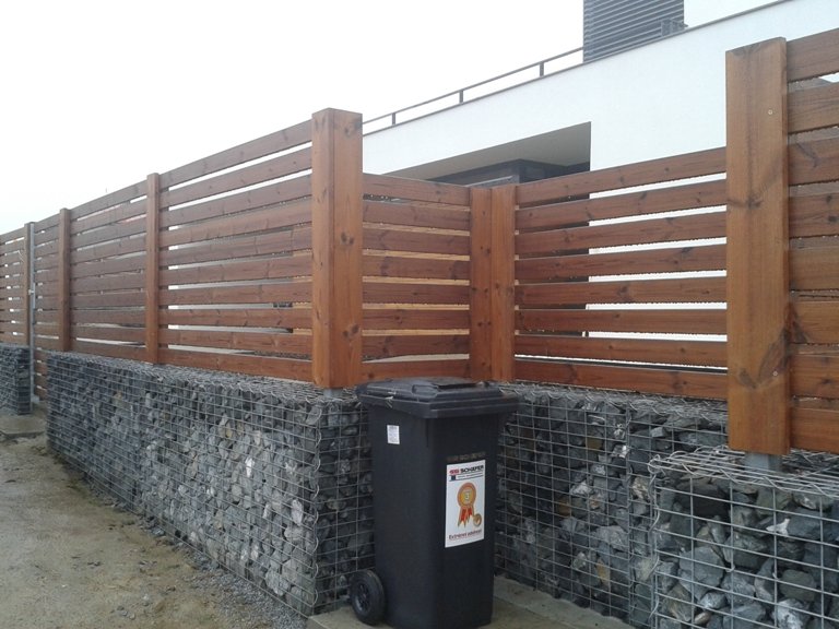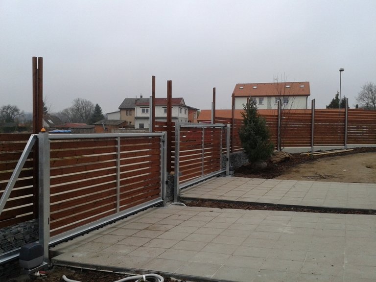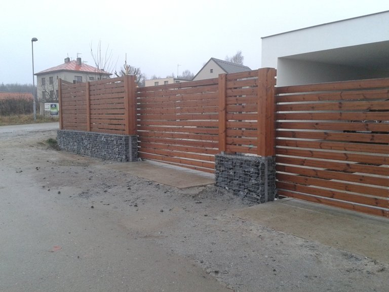 Přední část tvoří gabionový plot, který slouží jako podezdívka. Na tomto gabionu jsou dále připevněny dřevěné výplně na kovových sloupcích. Výplně jsou ze sibiřské borovice – thermowood. Součástí předního plotu jsou i dvě samonosné brány, branka a nika pro popelnice.